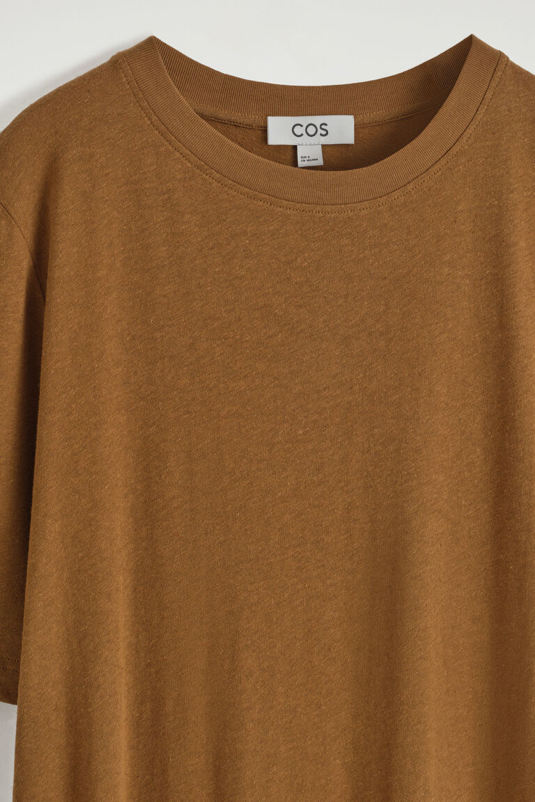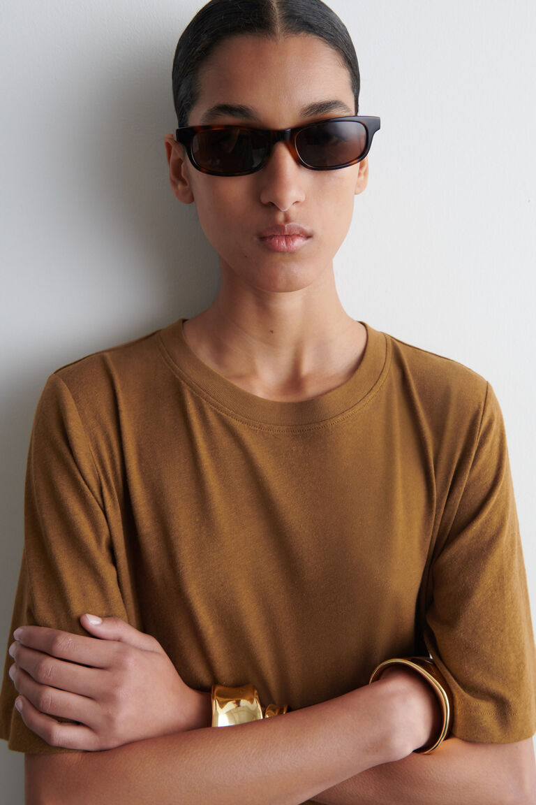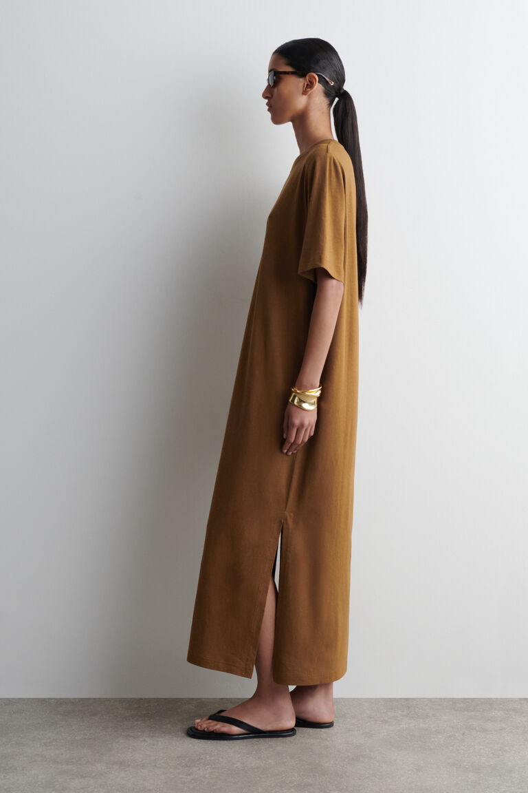 ชุดเดรสเสื้อยืดนี้เหมาะสำหรับวันที่แดดจ้าในเมือง มีเฉดสีโอคราเข้มข้น ผลิตจากผ้าฝ้ายเจอร์ซีย์พร้อมสัมผัสของผ้าลินินเพื่อความระบายอากาศได้ดี มาพร้อมคอเสื้อทรงกลม แขนสั้น และชายเสื้อแยกลึกที่ยาวลงถึงความยาวแม็กซี่
