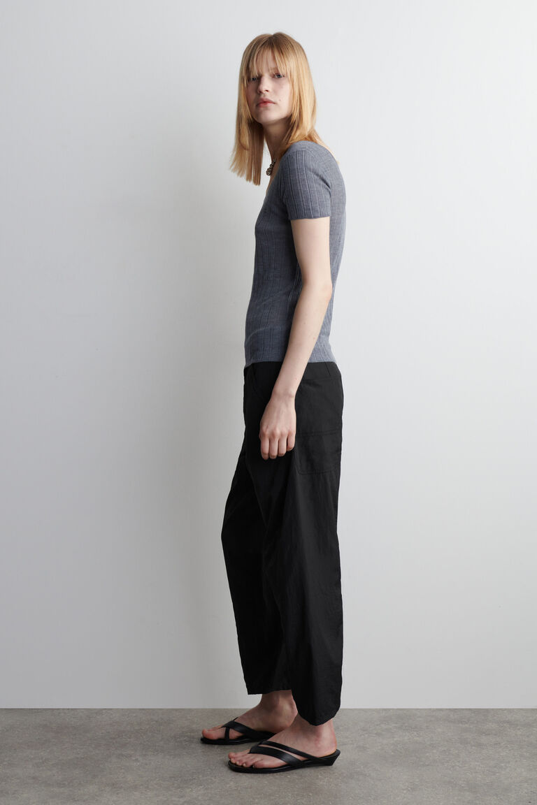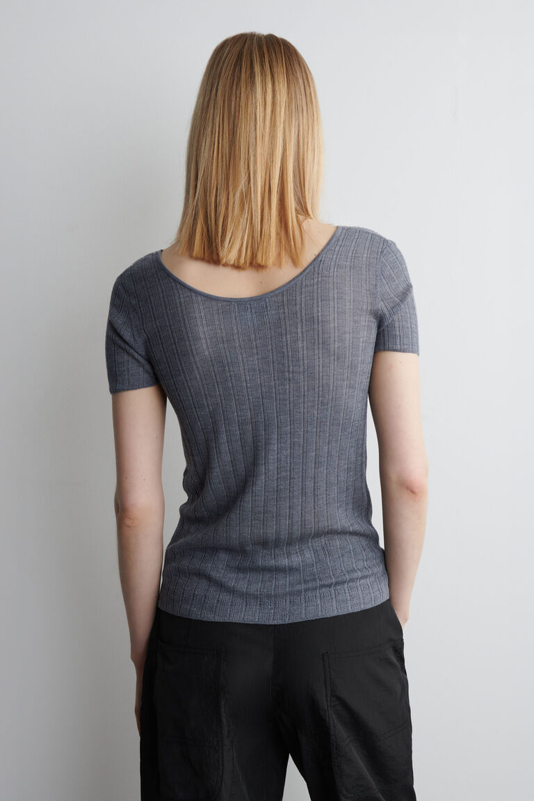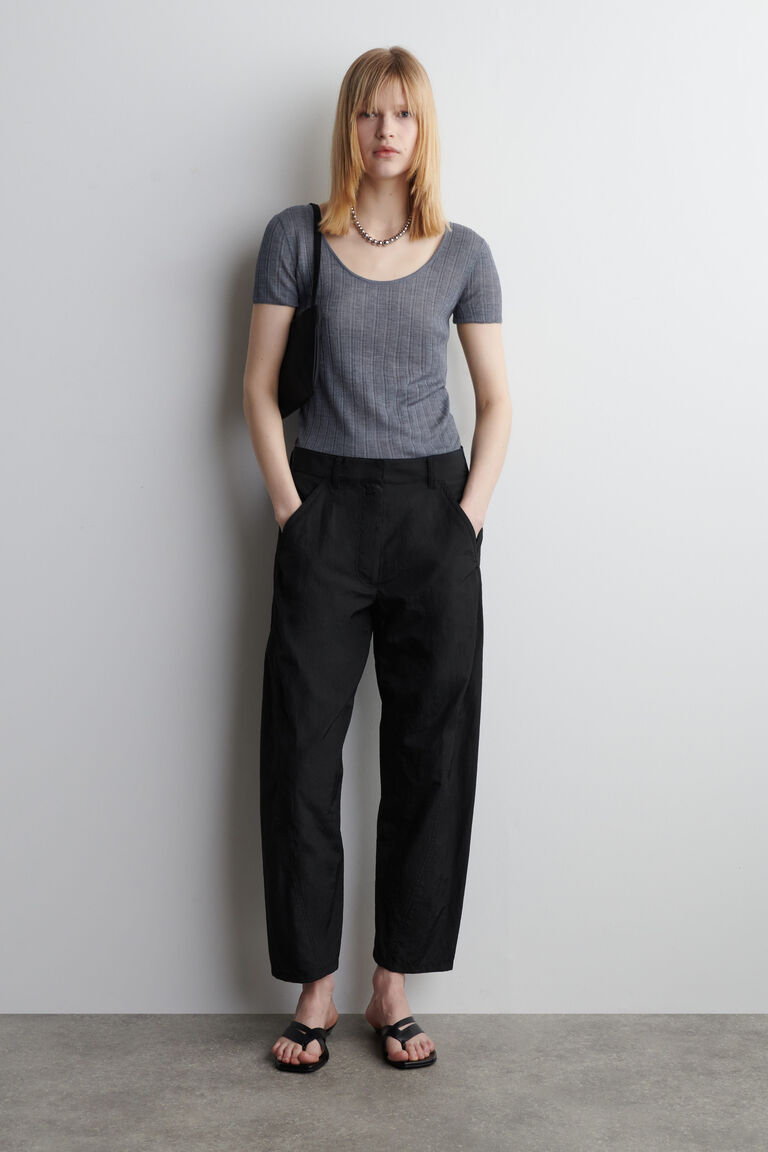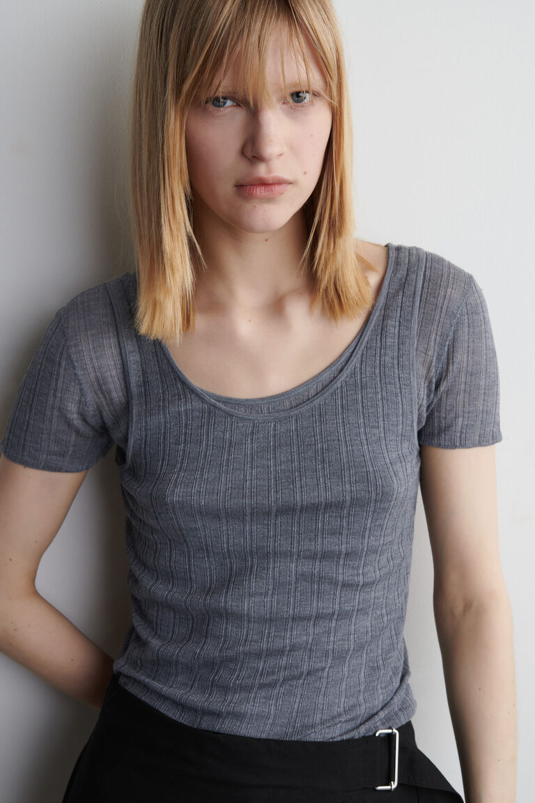 ผ้าคุณภาพสูงและเนื้อสัมผัสที่เชิญชวนเปลี่ยนโฉมเสื้อ T-shirt แบบคลาสสิกของ COS ให้ดูหรูหรา ย้อมในโทนเทา mélange ที่ทนทาน ชิ้นนี้ถูกตัดในทรง slim และถักด้วยไหม Mulberry silk และ Merino wool ที่นุ่มสุดหรู เสร็จด้วยคอวีและขอบรอบตัวแบบ tubular