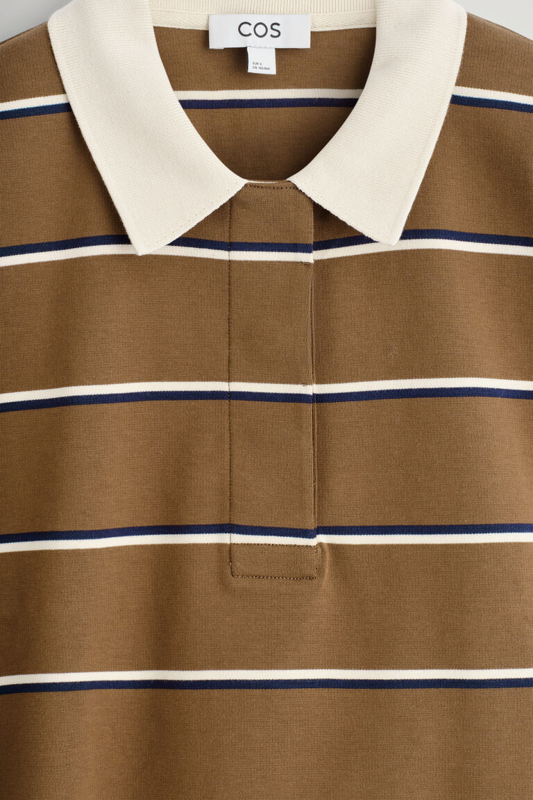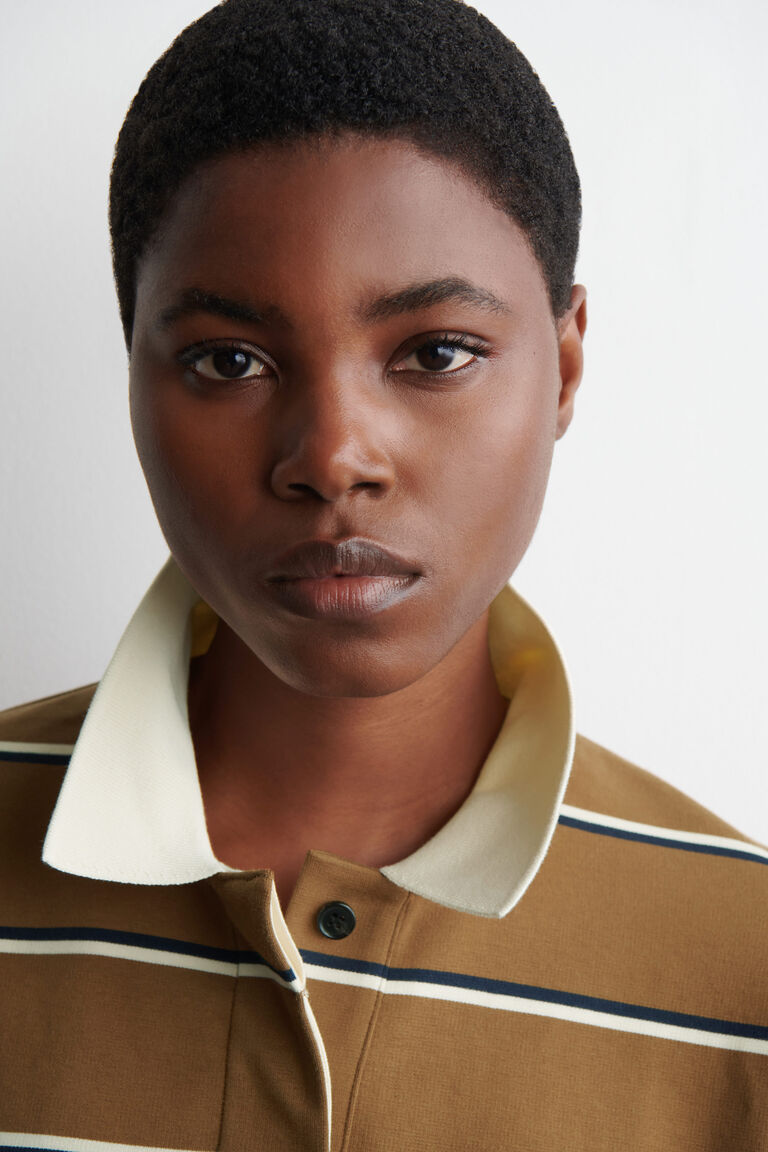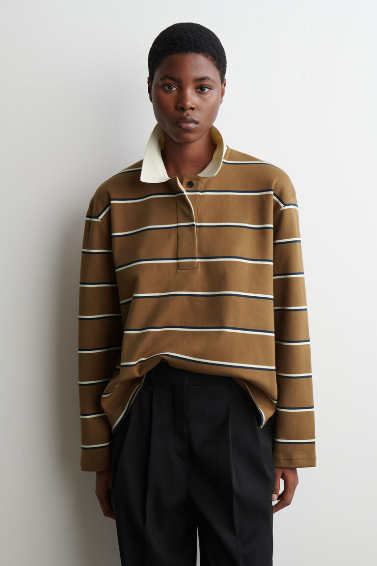 เสื้อท็อปนี้ทำจากผ้าฝ้ายเนื้อนุ่ม เป็นสไตล์ลำลองที่ได้แรงบันดาลใจจากเสื้อโปโลคลาสสิก มาพร้อมลายทางตัดกัน และออกแบบด้วยปกแบบกางออก แขนยาว และกระดุมปิดแบบซ่อนเรียบง่าย แมตช์กับกางเกงยีนส์ได้อย่างลงตัว