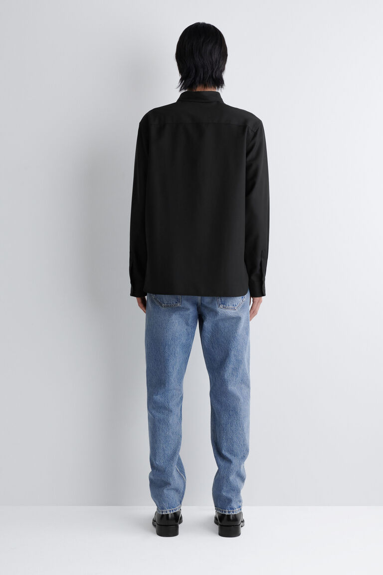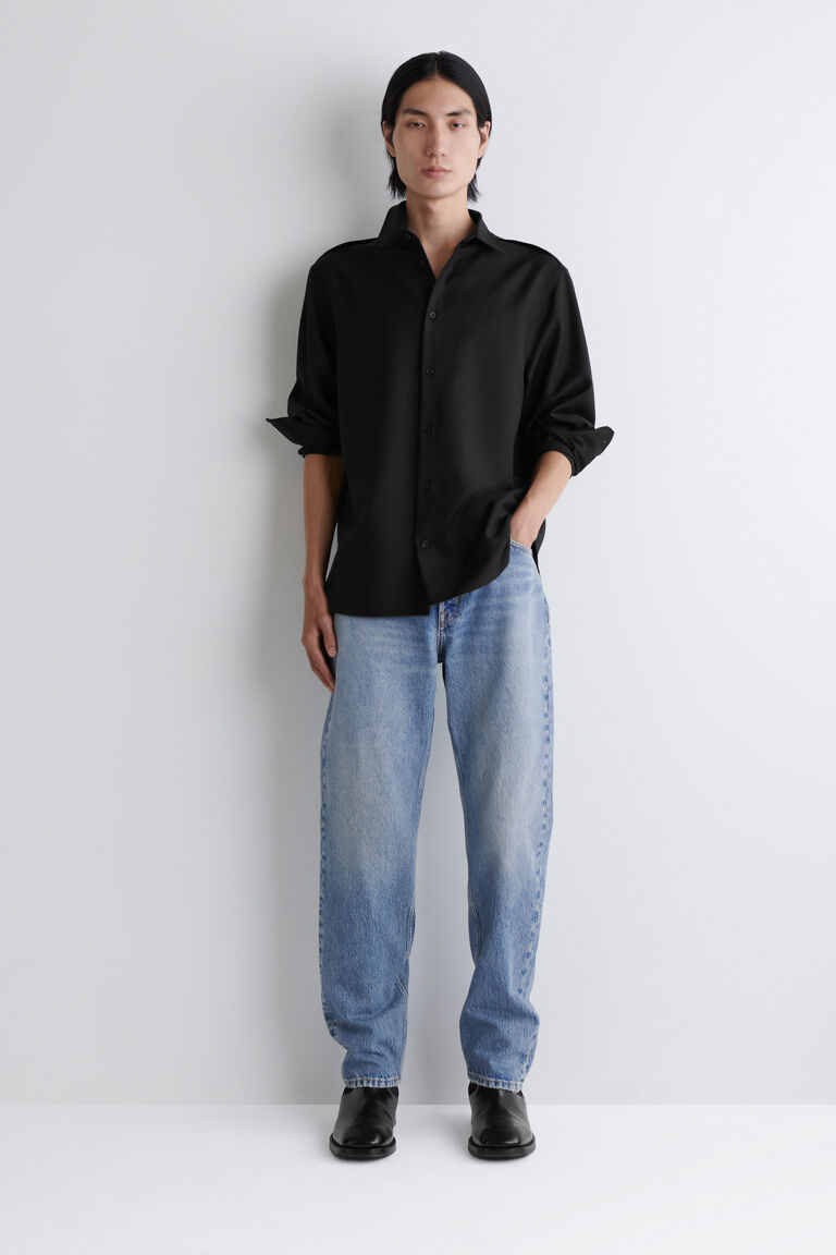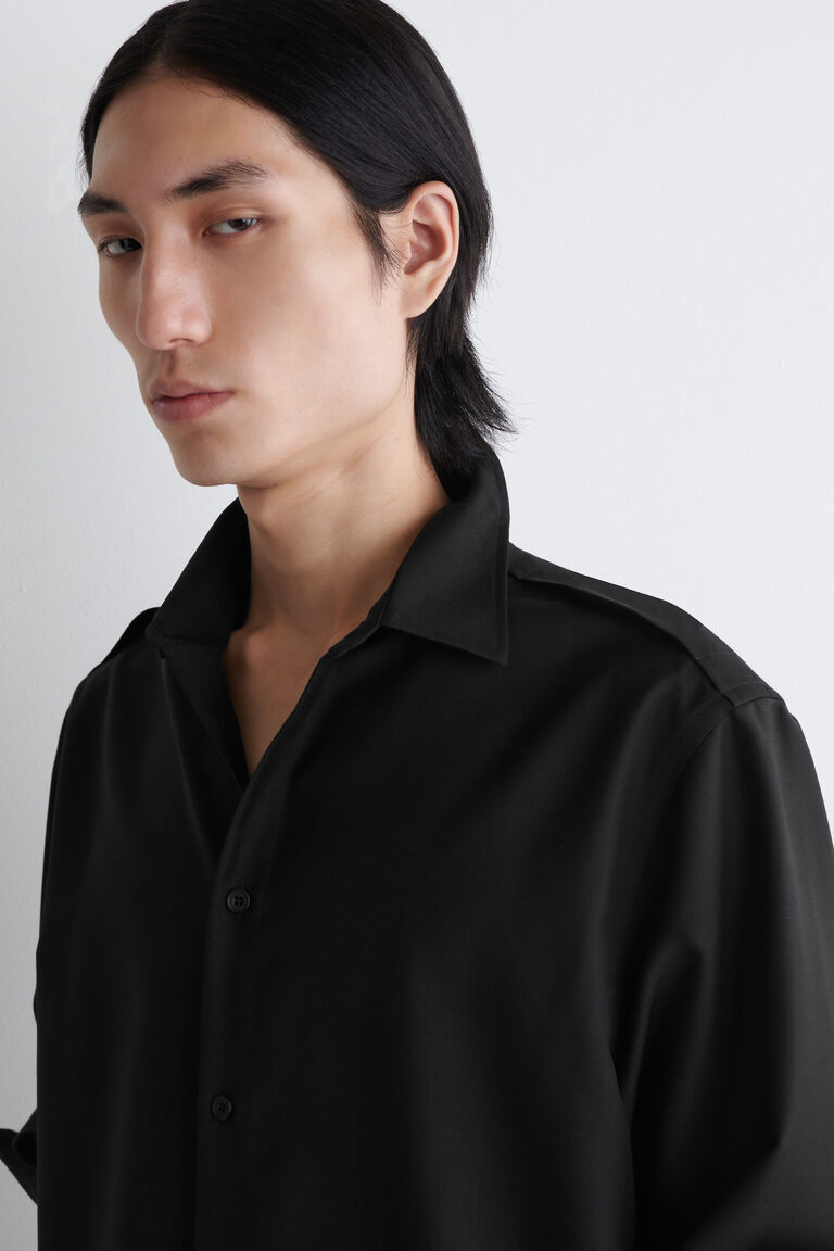 ชิ้นงานที่ปรับโฉมใหม่นี้ตีความรหัสของเสื้อเชิ้ตคลาสสิกใหม่อีกครั้ง ตัดเย็บในทรงทันสมัยและสบาย ๆ ทอจากขนแกะเมอริโนคุณภาพสูงที่มีสัมผัสนุ่มนวลและโครงสร้างเบา ๆ แมตช์กับกางเกงโทนสีเดียวกันเพื่อสร้างลุคโมโนโครม