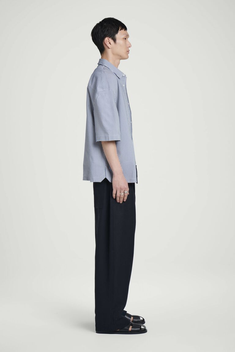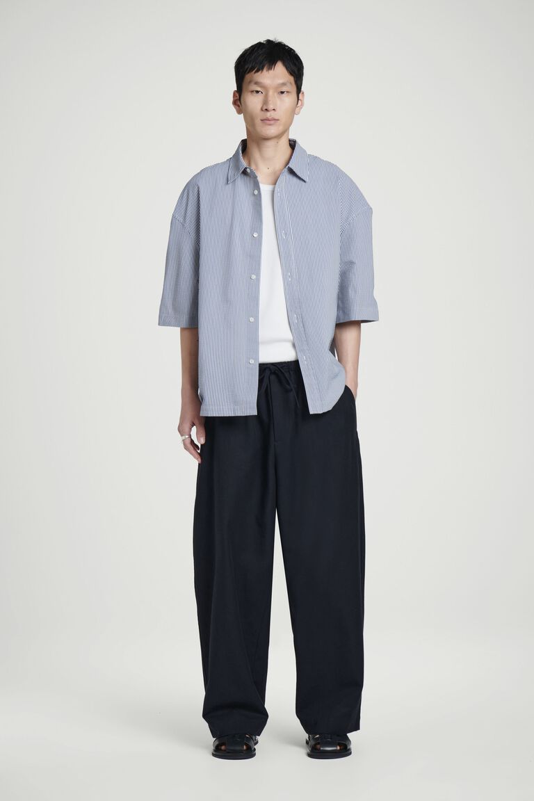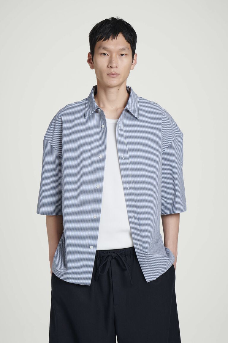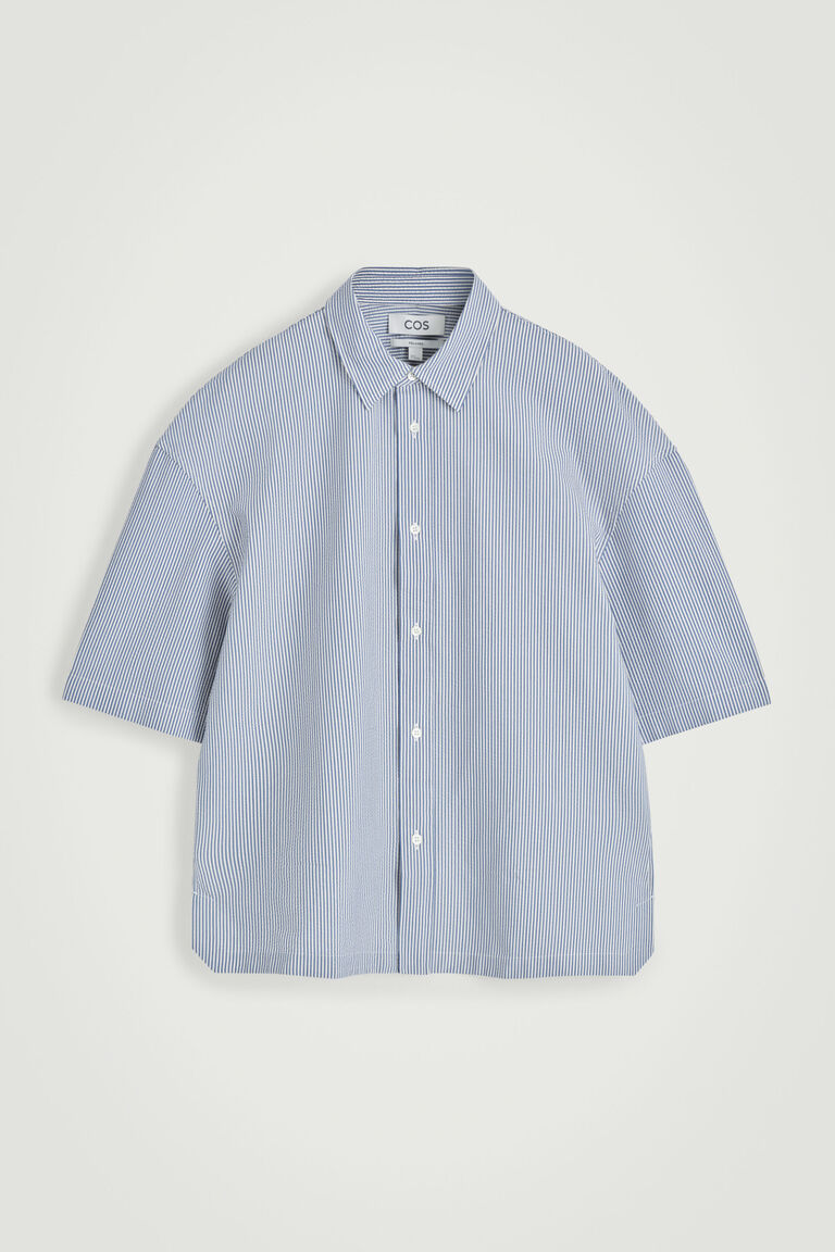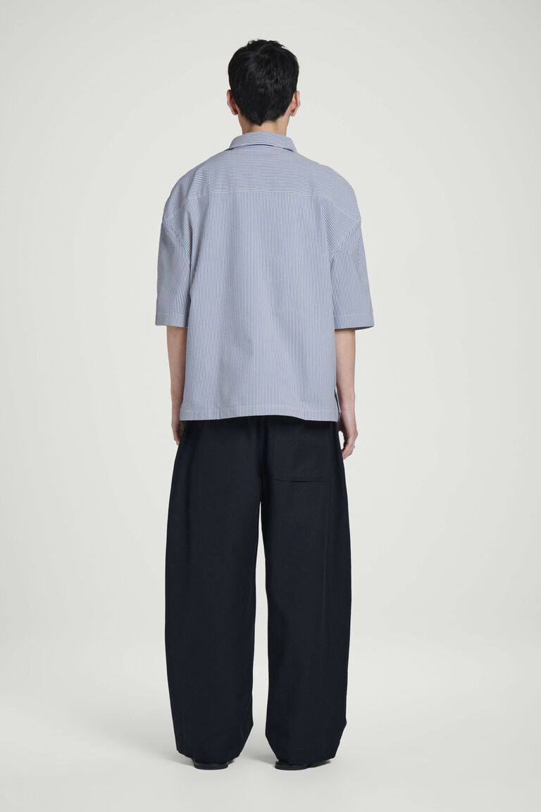 สำหรับฤดูกาลนี้ ทีมเสื้อผ้าบุรุษได้พิจารณาใหม่ถึงความสุภาพของเสื้อเชิ้ตผ้าป็อปลินคลาสสิก เสื้อเชิ้ตทรงผ่อนคลายตัวนี้ผลิตจากผ้า Pima cotton ผสมคุณภาพเยี่ยม และตัดเย็บในทรงหลวม แขนสั้น และชายเสื้อเหลี่ยม กระดุมเปลือกหอยมุกคือรายละเอียดการตกแต่งที่พิถีพิถัน