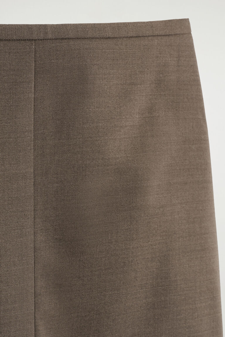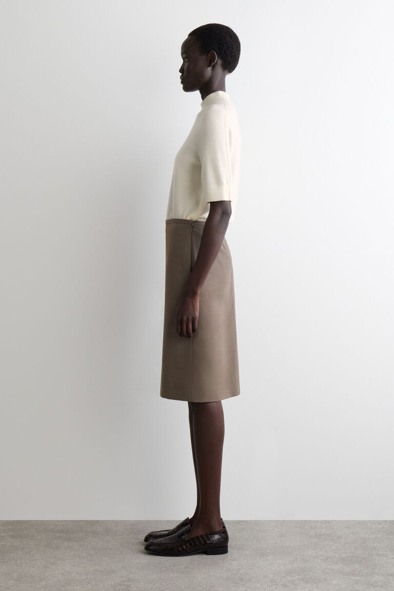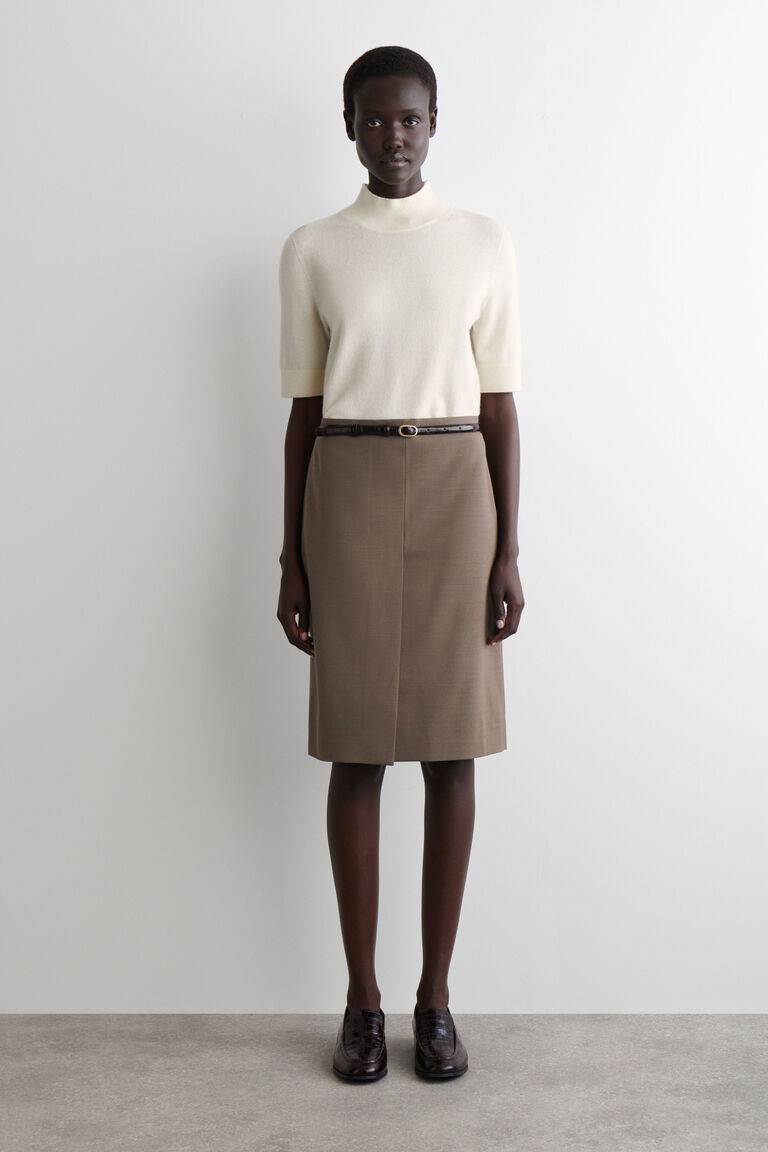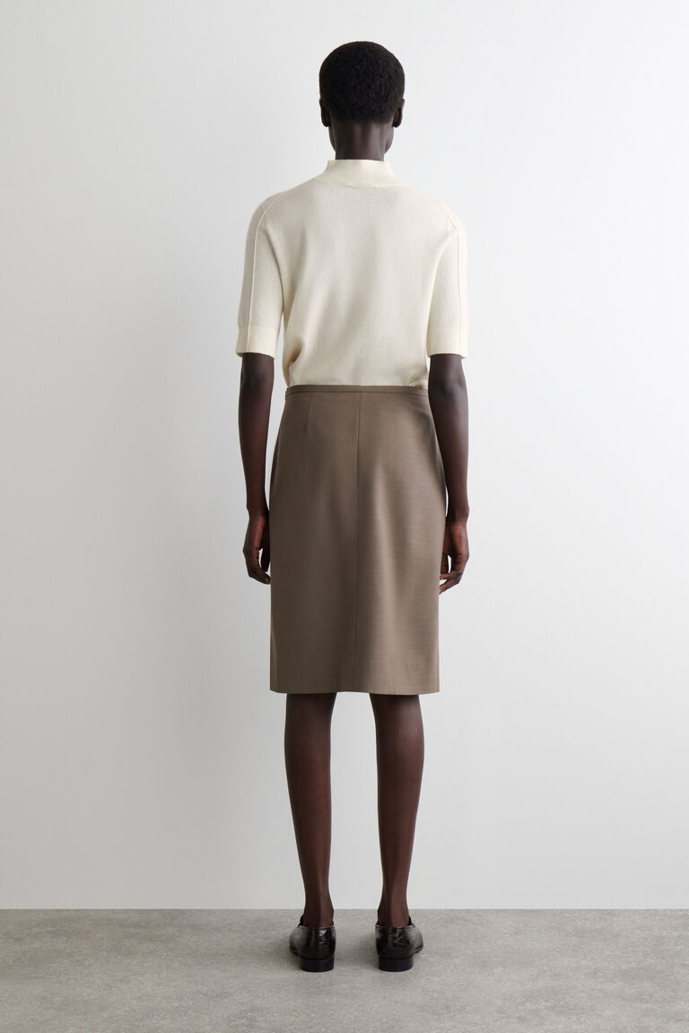 ทรงพลังด้วยความเรียบง่าย กระโปรงดินสอชิ้นนี้ผลิตจากผ้าทวิลผสมเมอริโนวูลคุณภาพสูงในเฉดสีน้ำตาลช็อกโกแลตเข้ม ขอบกระโปรงตัดเป็นทรงตรงพร้อมกับผ่าหน้าสำหรับความคล่องตัว และมีการเย็บรอยจีบเพื่อเน้นรูปร่างช่วงเอว