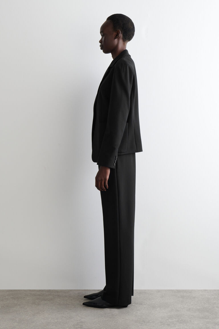 การตัดเย็บที่สมบูรณ์แบบเป็นหัวใจสำคัญของคอลเลกชันเสื้อผ้าผู้หญิงของ COS แจ๊กเก็ตเบลเซอร์ที่มีรูปทรงเรียบง่ายนี้ทำจากผ้านุ่มลื่นในโทนสีดำที่คงทน พร้อมด้วยปกแล็ปลายบาก เย็บเข้ารูปช่วงเอว และกระเป๋าแบบแปะ สามารถสไตล์เป็นชุดสูทคู่กับ กางเกงเข้าชุด ได้
