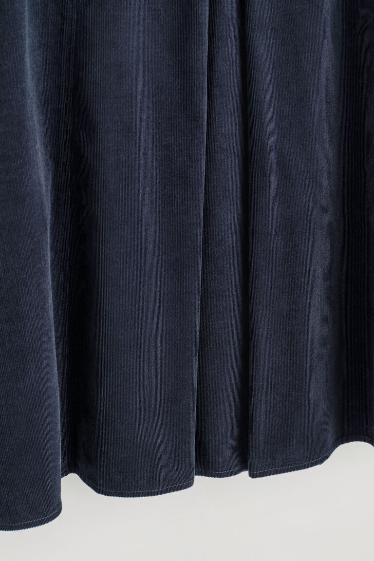 กระโปรงมิดิสไตล์โมเดิร์นนี้โดดเด่นด้วยผ้าคอตตอนคอร์ดูรอยที่มีเนื้อสัมผัสลึกในเฉดสีน้ำเงินเข้มเหมือนกลางคืน ตัดเย็บด้วยพับกล่องลึกที่ด้านหน้าและมาพร้อมกับกระเป๋าเพื่อรักษารูปทรงที่ดูเรียบหรู แมตช์กับบูทสูงถึงเข่าเพื่อสไตล์ที่สมบูรณ์แบบ