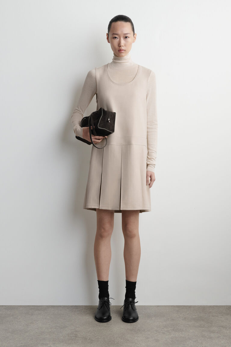 เดรสมินิทรงโมเดิร์นนี้ได้รับแรงบันดาลใจจากโค้ดการตัดเย็บในยุค 80s ออกแบบในทรงคลาสสิก มาพร้อมกับคอเสื้อเว้ารูปโค้งที่ขอบตัดเฉียง รายละเอียดเข็มขัดเย็บตกแต่ง และจีบกลับแหลมคม สไตล์ด้วยเสื้อจัมเปอร์คลุมไหล่เพื่อความโดดเด่น
