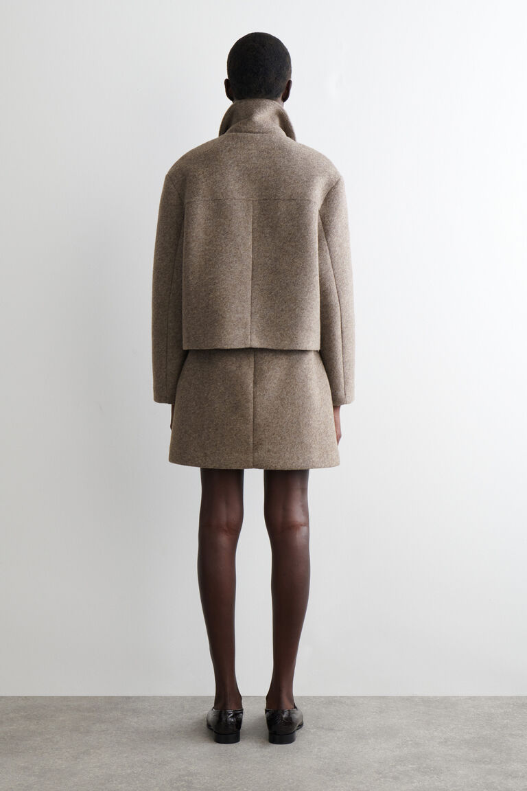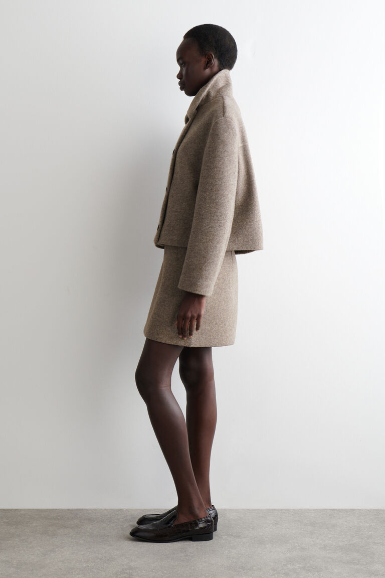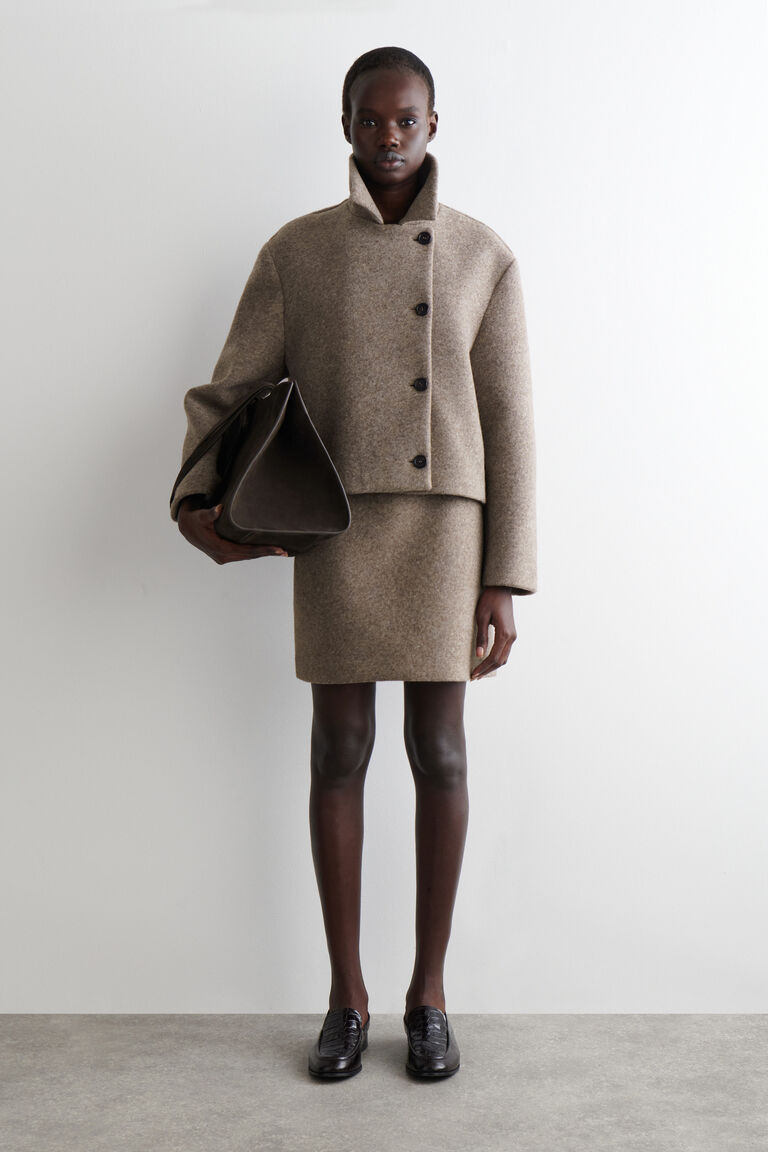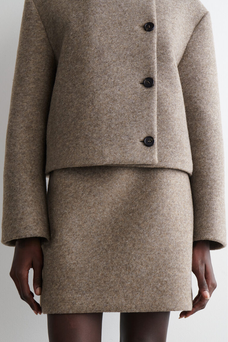 เสนอในโทนเมลานจ์เบจ มินิสเกิร์ตที่มีโครงสร้างนุ่มนวลนี้ผลิตจากผ้าวูลต้มแน่นที่ให้สัมผัสหรูหรา ออกแบบในทรงตรงพร้อมตะเข็บจับจีบด้านหลังเพื่อรูปทรงที่ชัดเจน จับคู่กับ แจ็กเก็ตที่เข้าชุดกัน เพื่อเรียนรู้การแต่งตัวชุดเครื่องแบบฤดูหนาวอย่างมีสไตล์