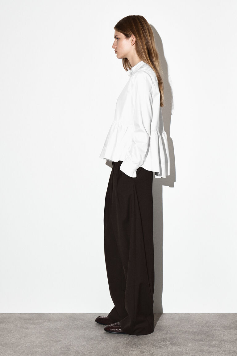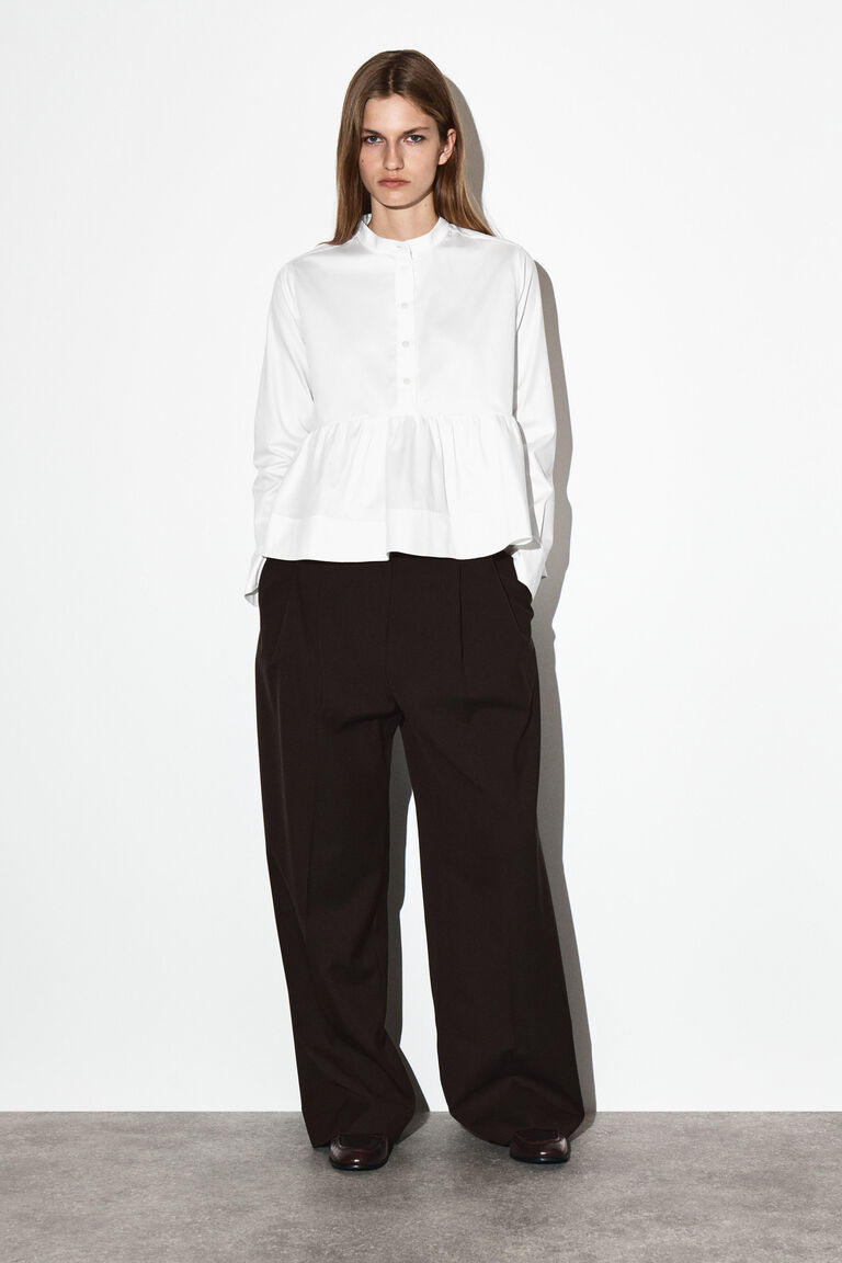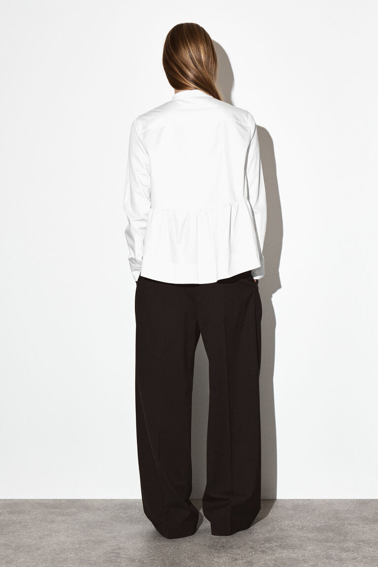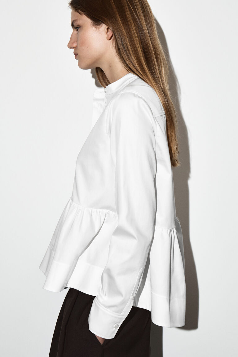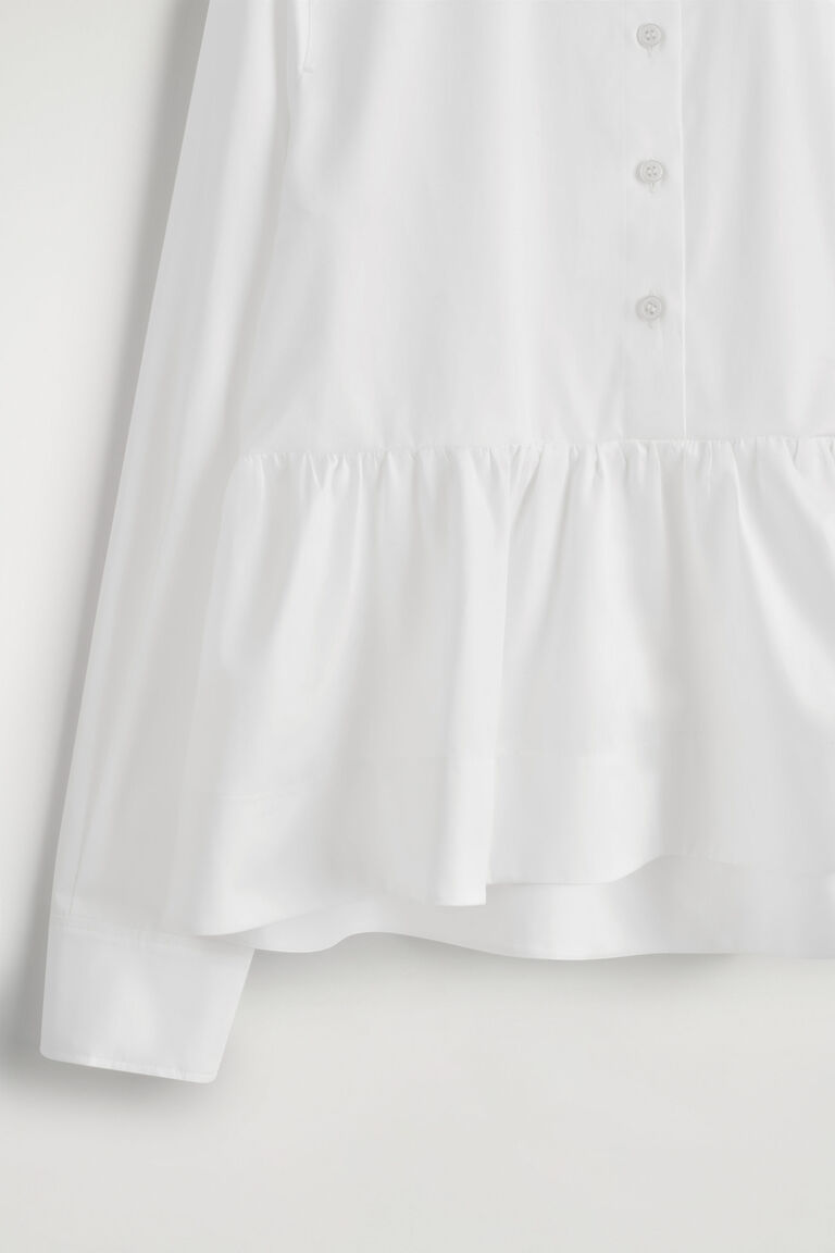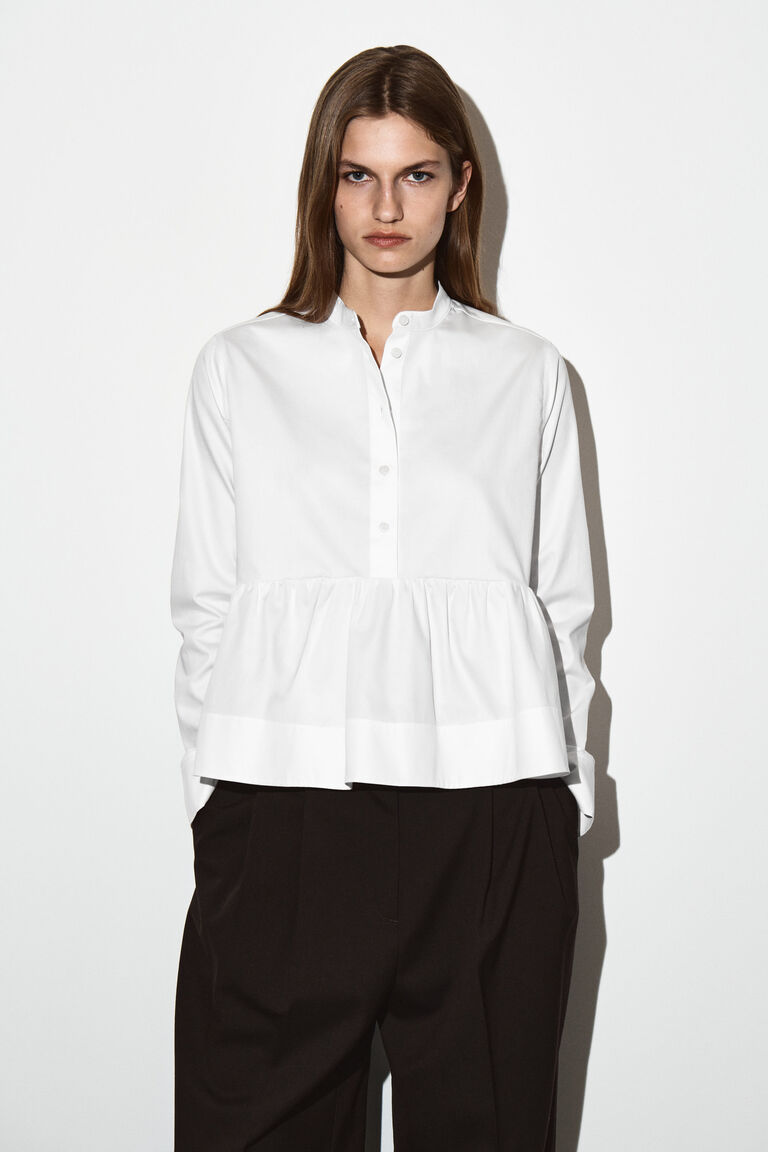 เสื้อเชิ้ตสไตล์ peplum นี้ตีความใหม่ด้วยความสง่างามร่วมสมัย ผลิตจากผ้าฝ้ายเนื้อกรอบ พร้อมคอเสื้อทรงกลม และยังคงเอกลักษณ์ของเสื้อเชิ้ตคลาสสิก เช่น ปลายแขนที่ติดกระดุม