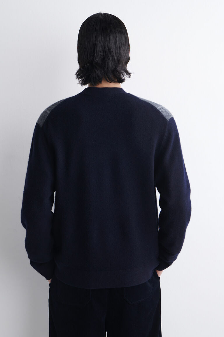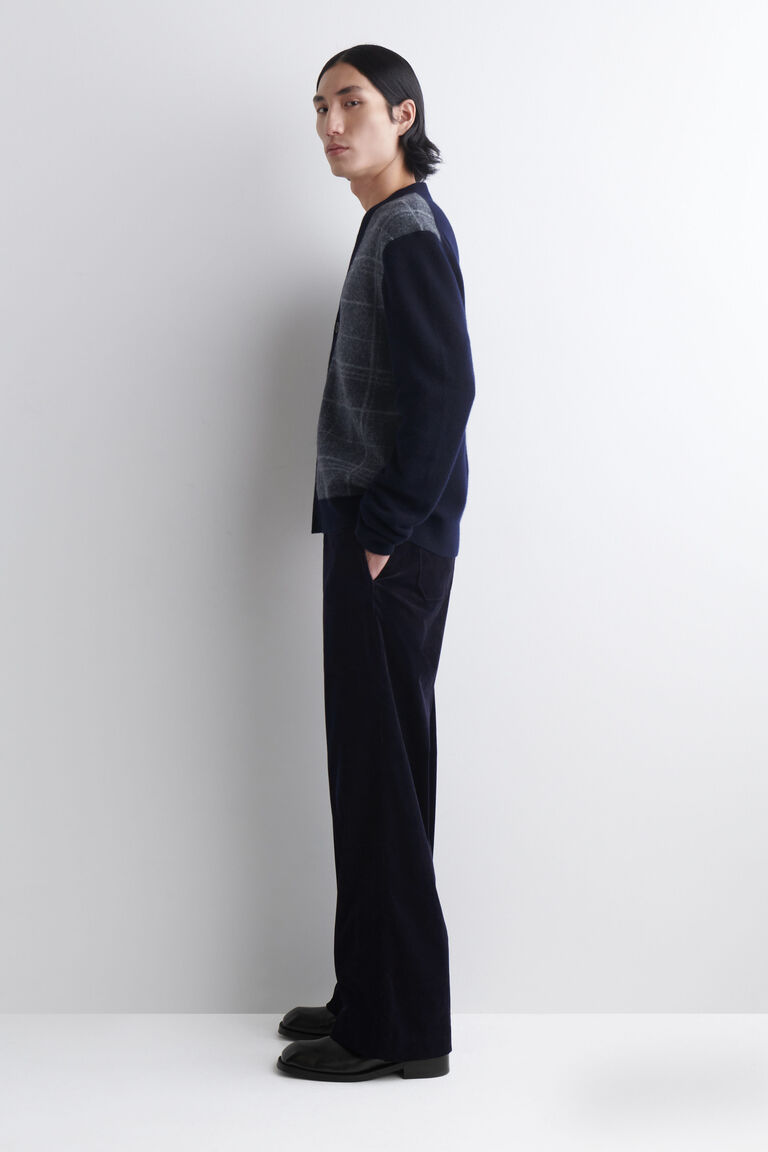ฤดูกาลนี้ ทีมเสื้อผ้าผู้ชายได้ตีความใหม่ผ้าถักมรดกทางวัฒนธรรมผ่านมุมมองเฉพาะของ COS ชิ้นงานทันสมัยชิ้นนี้ถักจากขนแกะพรีเมียม และออกแบบด้วยแผงลายแจ็คการ์ดเช็คที่ด้านหน้า ซึ่งเข้ากับโทนสีน้ำเงินเข้มอย่างลงตัว แมตช์กับชุดสูทและรองเท้าหุ้มส้นได้อย่างดี
