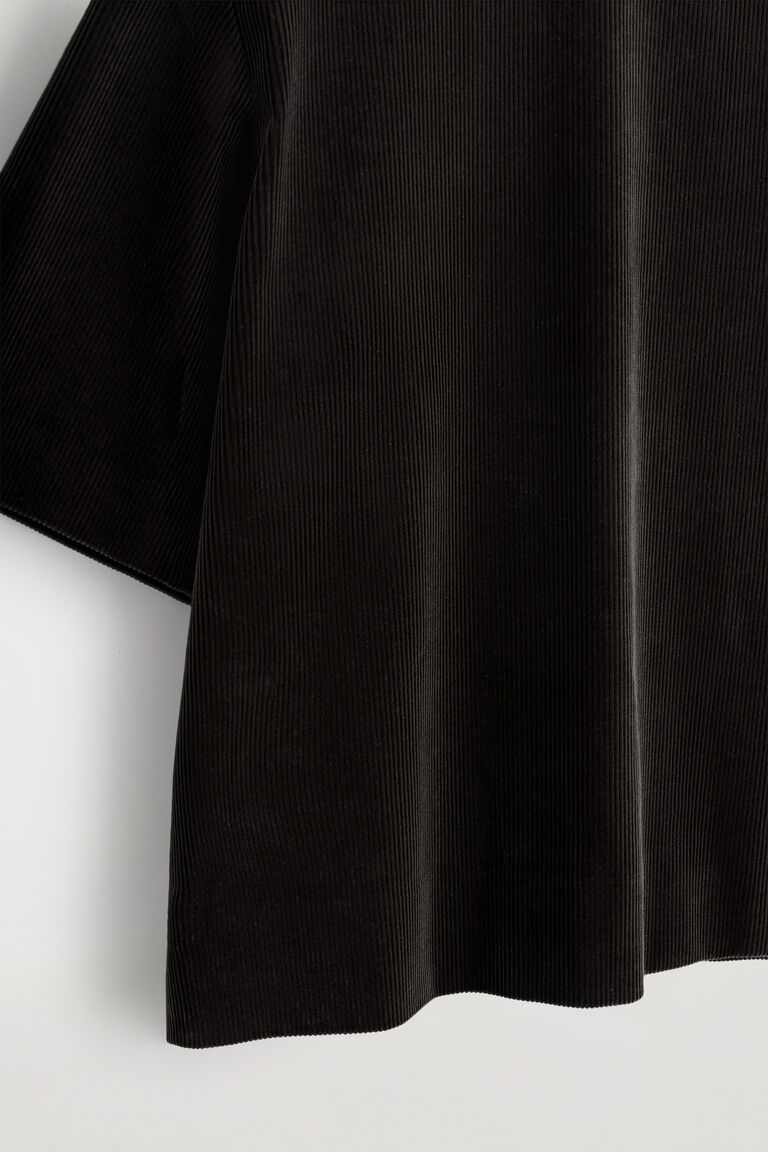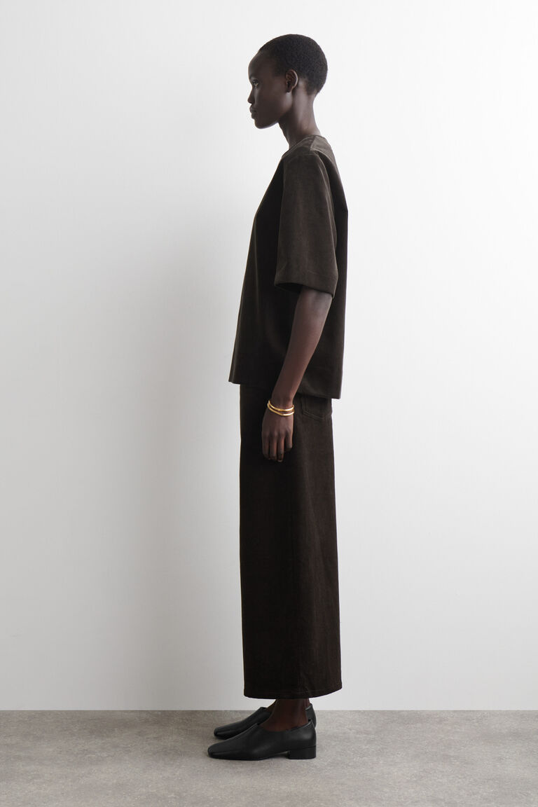ทีมเสื้อผ้าสตรีของ COS ได้ตีความเสื้อยืดคลาสสิกใหม่สำหรับฤดูใบไม้ร่วง/ฤดูหนาว ด้วยเนื้อผ้าที่มีมิติ เสื้อท่อนี้ทำจากผ้าคอตตอนคอร์ดูรอยที่มีสัมผัสนุ่มในโทนช็อกโกแลต พร้อมการออกแบบขอบผ้าป๊อปลินรอบคอ ตัดเย็บในทรงสบายพร้อมรอยแยกที่ชายเสื้อ