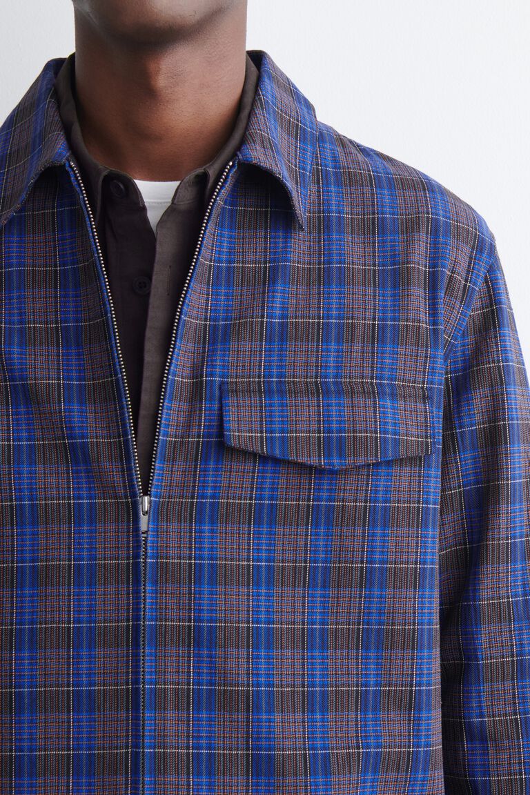 โดดเด่นด้วยลวดลายตารางที่กล้าหาญ ชิ้นนี้นำเสนอการตีความร่วมสมัยของเสื้อแจ็คเก็ตเชิ้ตคลาสสิก ผลิตจากผ้าฝ้ายเนื้อนุ่ม และออกแบบด้วยปกแหลม กระเป๋าแปะหน้าอก และซิปสีเงินเงา