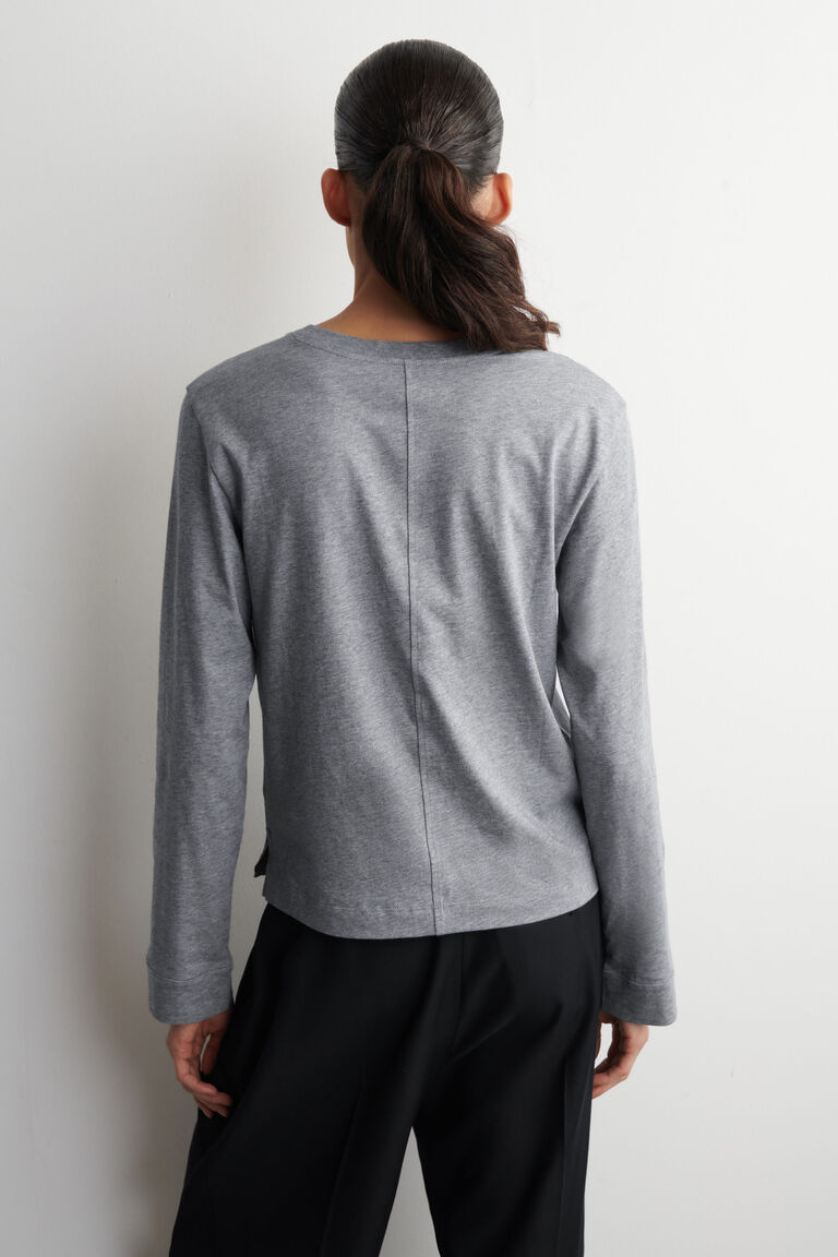 เสื้อยืดแขนยาวเป็นไอเท็มเด่นของตู้เสื้อผ้าช่วงเวลาพักผ่อน ตัดเย็บในทรงโอเวอร์ไซส์ชิ้นนี้ทำจากผ้าฝ้ายออร์แกนิกเจอร์ซีย์น้ำหนัก 160gsm ที่นุ่มนวลและผ่านการแปรงผิวเพื่อสัมผัสที่นุ่มละมุน ตกแต่งด้วยคอเสื้อทรงริบและกระเป๋าแปะที่หน้าอก