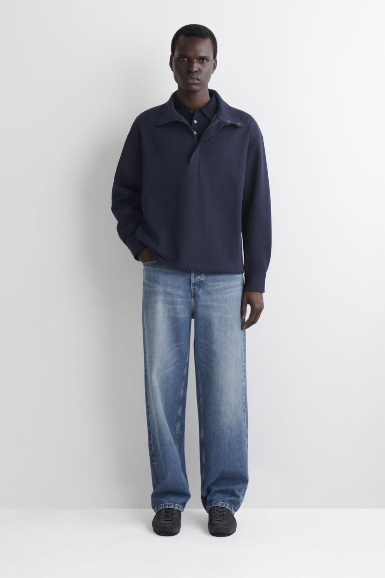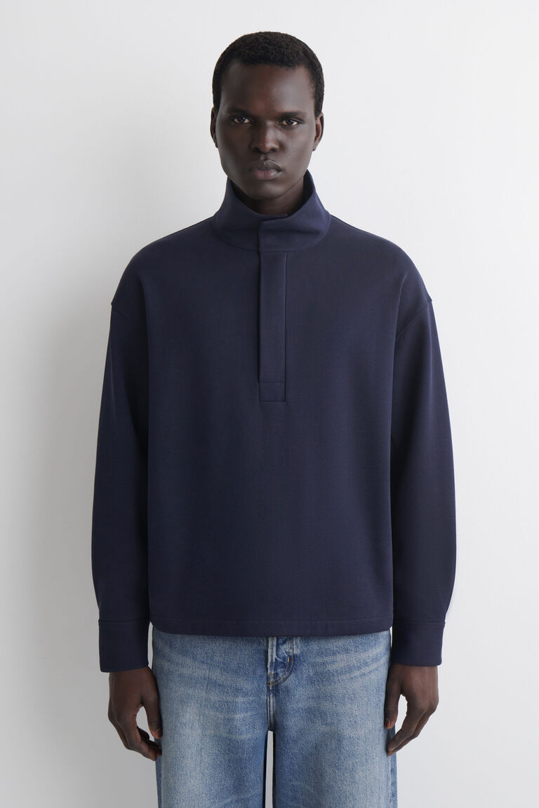 ทีมเสื้อผ้าผู้ชายได้รับแรงบันดาลใจจากสไตล์ athleisure ในยุค 90s เมื่อออกแบบ sweatshirt ตัวนี้ มาในสี navy คลาสสิก ผลิตจากผ้าคอตตอนเจอร์ซีย์นุ่มในทรง oversized พร้อมด้วยคอเสื้อแบบ funnel, กระดุมซ่อน และกระเป๋าข้าง จับคู่กับกางเกงที่เข้าชุดกันเพื่อสไตล์ที่สมบูรณ์แบบ