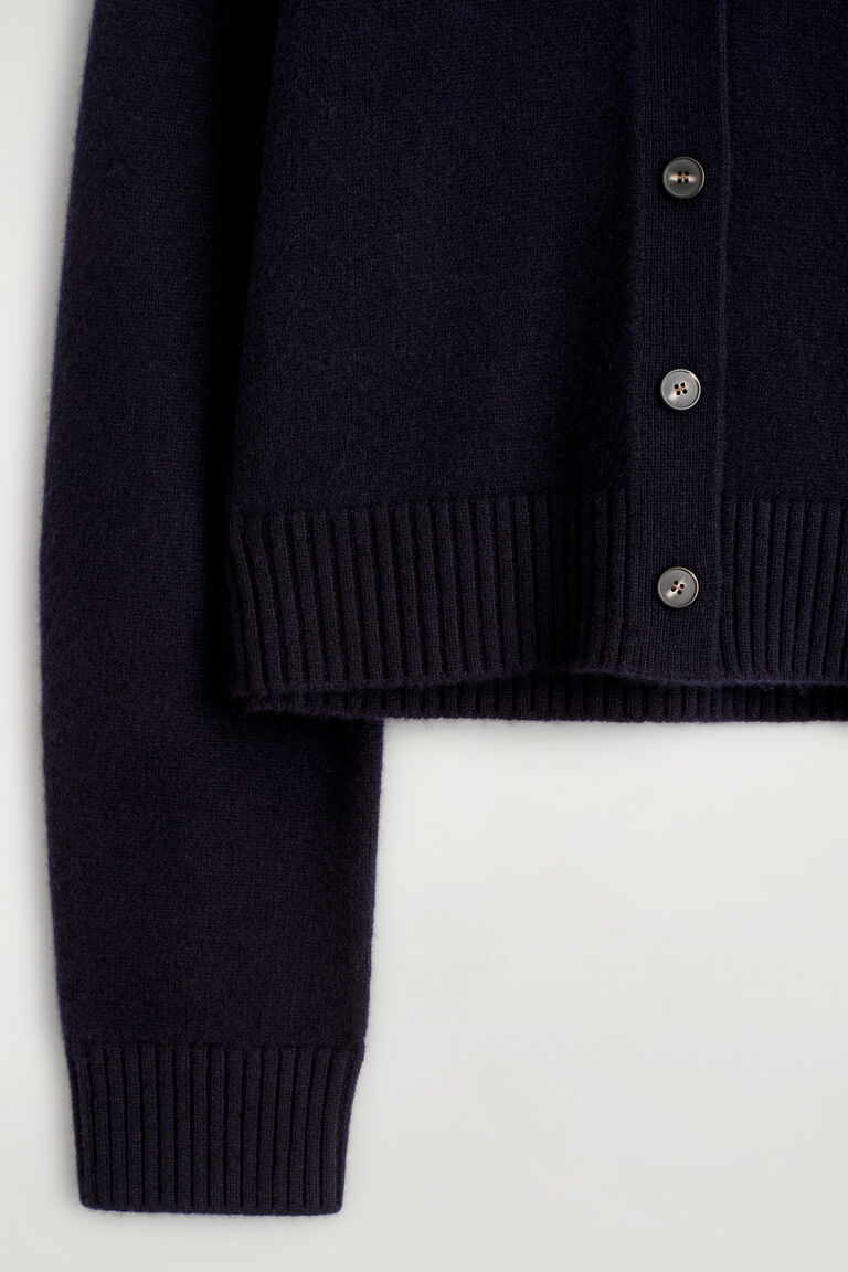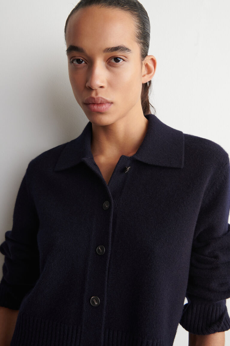 คาร์ดิแกนสีกรมท่าที่ถักจากขนแกะเมอริโนคุณภาพสูง ซึ่งเลือกใช้เพราะสัมผัสที่นุ่มเป็นพิเศษ มาพร้อมกับปกคลาสสิกและแถวกระดุมเรียบร้อย แขนและชายเสื้อถักแบบริบเพื่อความรู้สึกสัมผัสที่ดี สามารถจับคู่กับกางเกงยีนส์คลาสสิกได้อย่างลงตัว