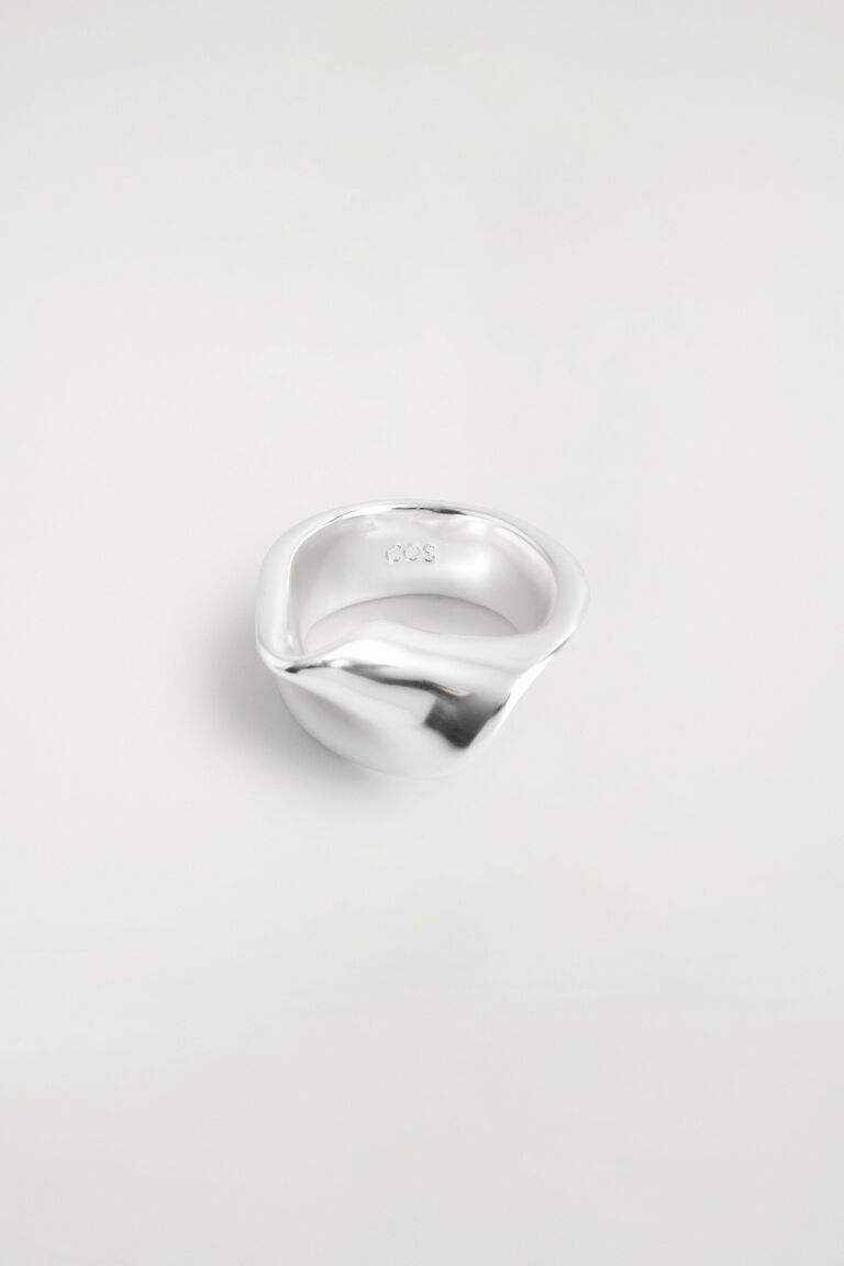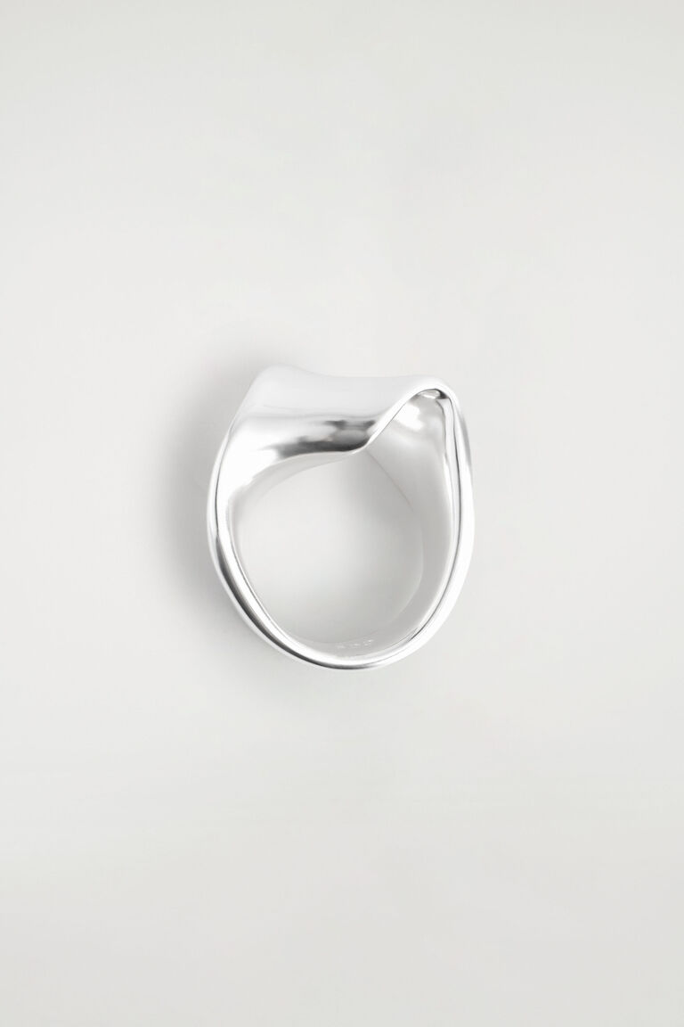 โดดเด่นด้วยเสน่ห์แห่งรูปทรงประติมากรรม แหวนสมัยใหม่ชิ้นนี้มีรูปทรงเหมือนริบบิ้นบิดที่พันรอบนิ้วมือ ผลิตจากทองเหลืองชุบเงินที่ขัดเงาให้เป็นประกายอย่างนุ่มนวล