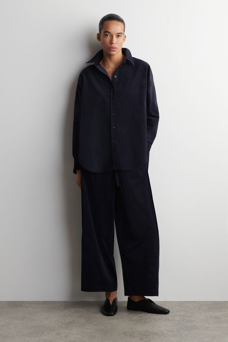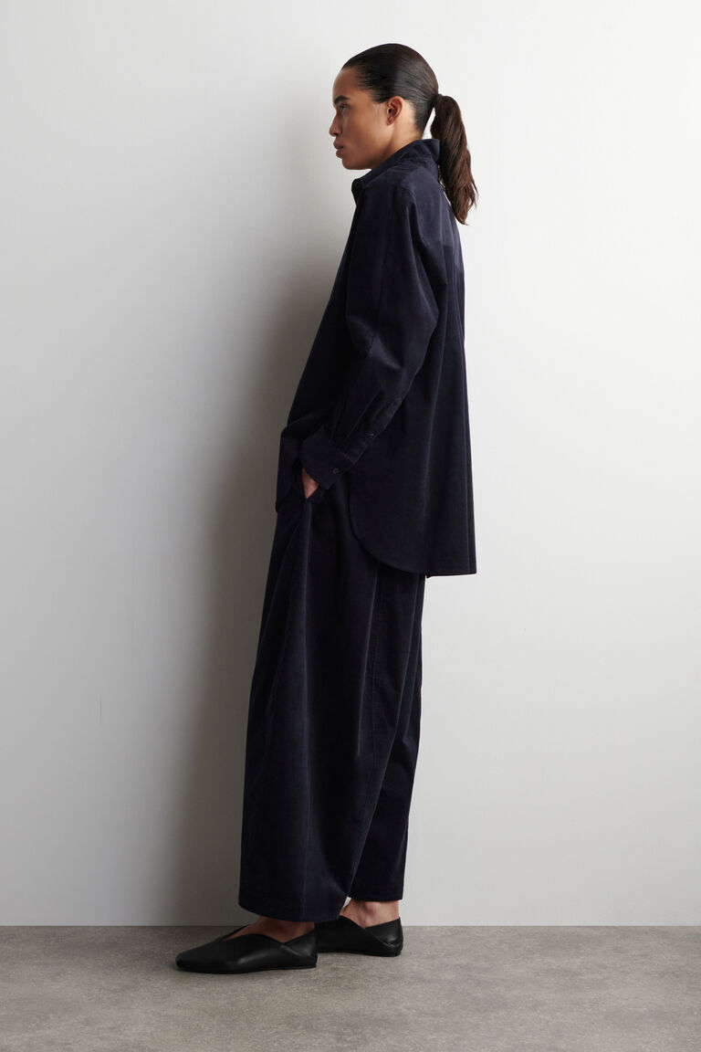 เสื้อเชิ้ตทรงบานที่ตัดเย็บอย่างประณีตนี้ ผลิตจากผ้าคอตตอนคอร์ดูรอยที่สัมผัสได้ พร้อมด้วยปกคอแหลมคลาสสิก ข้อมือมีปุ่มกระดุม และชายเสื้อโค้งเป็นขั้นบันได สไตล์นี้เหมาะกับการจับคู่กับกางเกงยีนส์เพื่อลุคที่ดูเรียบหรูในชีวิตประจำวัน