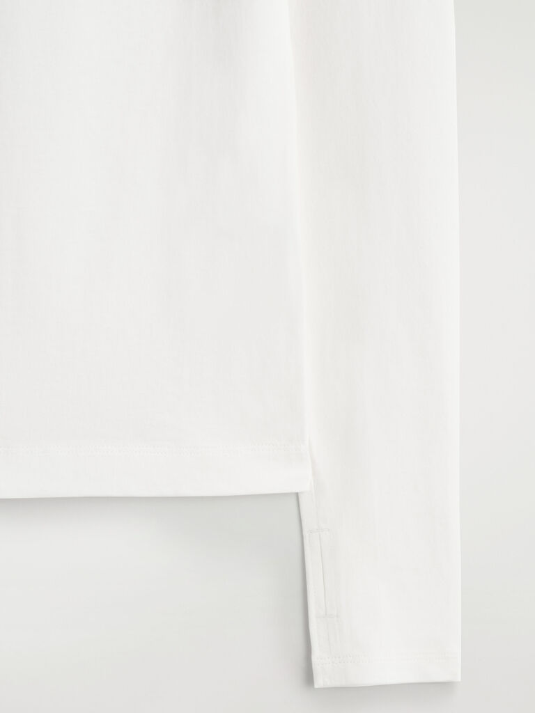 เสื้อแขนยาวเป็นไอเท็มพื้นฐานของตู้เสื้อผ้าสมัยใหม่ ชิ้นนี้มีคอเสื้อแบบ crew-neck ตัดเย็บในทรงเข้ารูป และผลิตจากผ้าฝ้ายเนื้อนุ่มพิเศษที่มีส่วนผสมของอีลาสเทนเล็กน้อยเพื่อความสบาย พร้อมด้วยข้อมือที่มีรูสอดนิ้วหัวแม่มือเป็นเอกลักษณ์