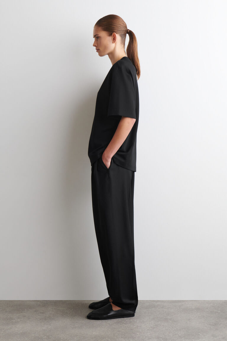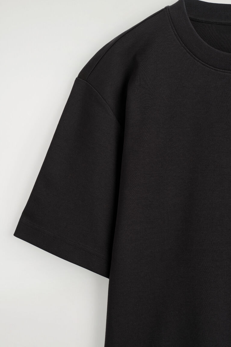 ซิลูเอตโอเวอร์ไซส์เป็นเอกลักษณ์การออกแบบของ COS มาอย่างยาวนาน ทีเชิ้ตสีดำตัวนี้ให้ความรู้สึกสบายๆ ด้วยผ้าคอตตอนเจอร์ซีย์น้ำหนัก 290gsm ที่นุ่มนวล ตัดเย็บด้วยคอเสื้อริบแบบครูว์ แขนสั้นยาวพิเศษ และชายเสื้อกว้างเพื่อให้ผ้าตกอย่างเป็นธรรมชาติ