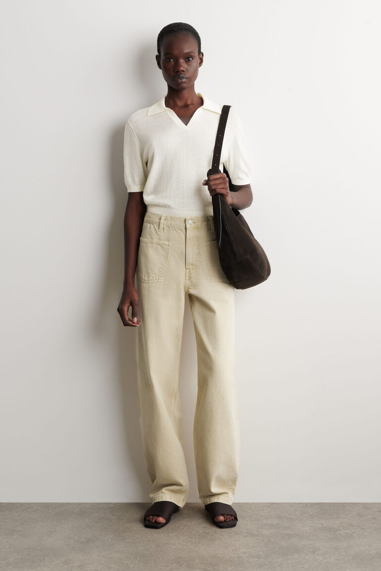 เสื้อโปโลสุดประณีตนี้ถักทอจากขนแกะเมอริโนและผ้าลินิน มอบความนุ่มหรูหราและสัมผัสที่มีมิติ โดดเด่นด้วยโทนสีเบจหินที่ละเอียดอ่อน พร้อมดีไซน์ปกเปิด ขอบเอวแบบริบที่เข้ารูป และรายละเอียดการตัดเย็บที่ไหล่
