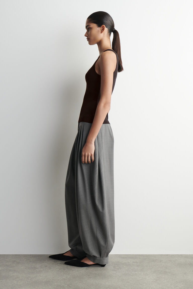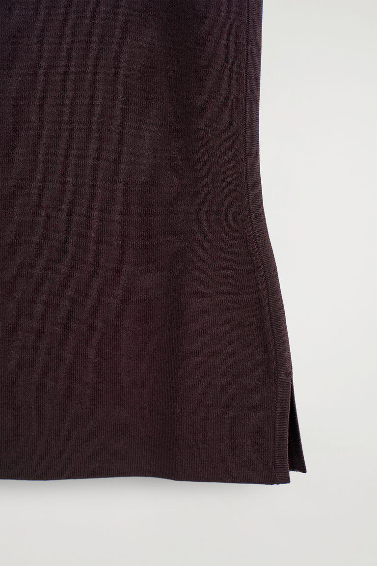 เสื้อกล้ามคลาสสิกเป็นพื้นฐานของตู้เสื้อผ้าประจำวัน ตัดเย็บในทรงสลิม ชิ้นผ้าถักนี้มาในโทนสีน้ำตาลช็อกโกแลตเข้มที่มอบความเป็นไปได้ในการสไตลิ่งอย่างมีพลัง คอเสื้อทรงสกูปตกแต่งขอบท่อ ส่วนตะเข็บข้างที่ออกแบบอย่างประณีตนำไปสู่ชายเสื้อที่แยกเป็นสองข้าง