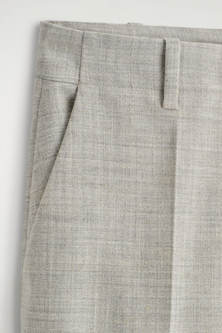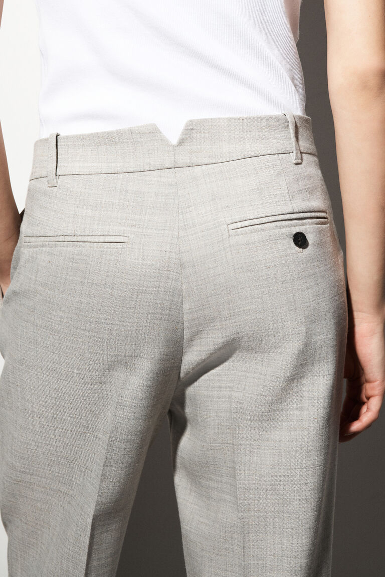 ชุดสูทพลังแห่งความมั่นใจ ในรูปแบบใหม่: กางเกงเหล่านี้ผลิตจากผ้าขนสัตว์ผสมคุณภาพสูงในเฉดสีทอปแบบเฮเทอร์ที่มีมิติของเนื้อผ้า ออกแบบด้วยขากางเกงตรง รอยพับกางเกงที่ถูกกดอย่างประณีต และเอวสูงแบบเว้ารูปตัวโน้ต – ถ่ายทอดความมั่นใจจากแฟชั่นตัดเย็บยุค 80 ได้อย่างลงตัว สวมใส่เป็นชุดสูทคู่กับเบลเซอร์ที่เข้าชุดกัน