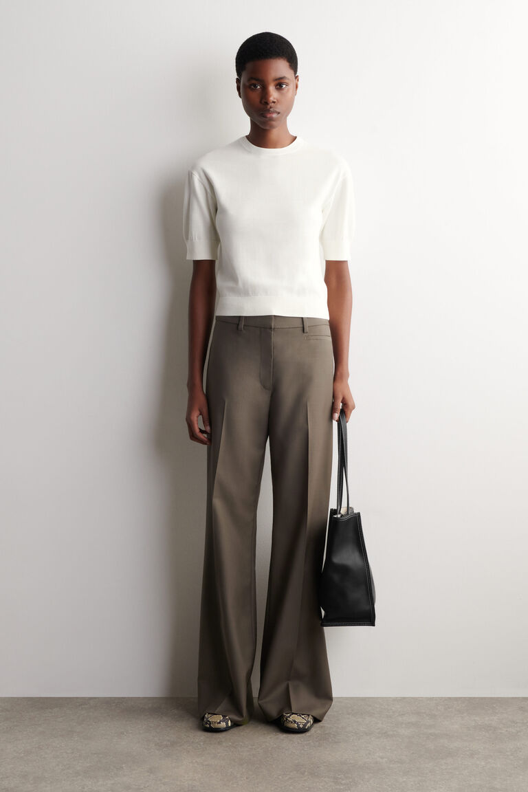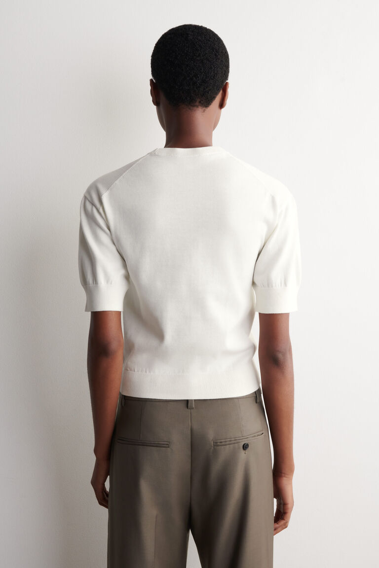 ไอเท็มพื้นฐานที่ปรับแต่งอย่างประณีตนำทางใหม่ให้กับตู้เสื้อผ้าประจำวัน เสื้อยืดตัวนี้ถักทอจากผ้าฝ้ายเนื้อนุ่มพิเศษในโทนสีน้ำตาลช็อกโกแลตอบอุ่น ออกแบบด้วยคอเสื้อแบบริบและแขนสั้นพอง พร้อมชายเสื้อแบบริบ